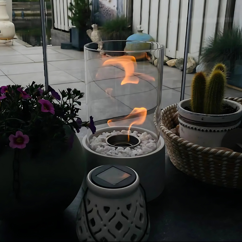 Maak elk moment speciaal met de Flame Draagbare Glazen Tafelhaard—bestel de uwe vandaag nog!
